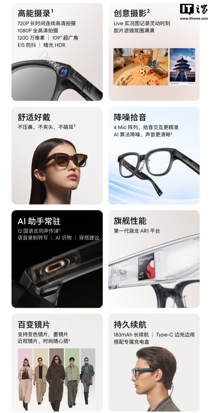 该眼镜搭载骁龙AR1芯片,使用5P定制光学镜头,匹配12MP传感器,覆盖109度超广角视场。支持720P高清视频不间断拍摄,横屏竖屏任意切换。同时还支持Live实况图、胶片风格滤镜、语音助手、识图翻译等AI功能。